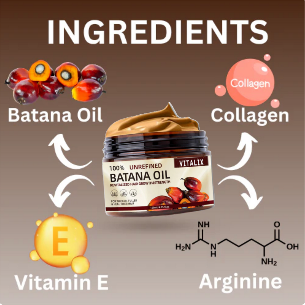 Our plant-powered blend is packed with carefully sourced, hair-enriching natural Batana oil, collagen, vitamin E, and Arginine that work in tandem to target hair growth holistically.